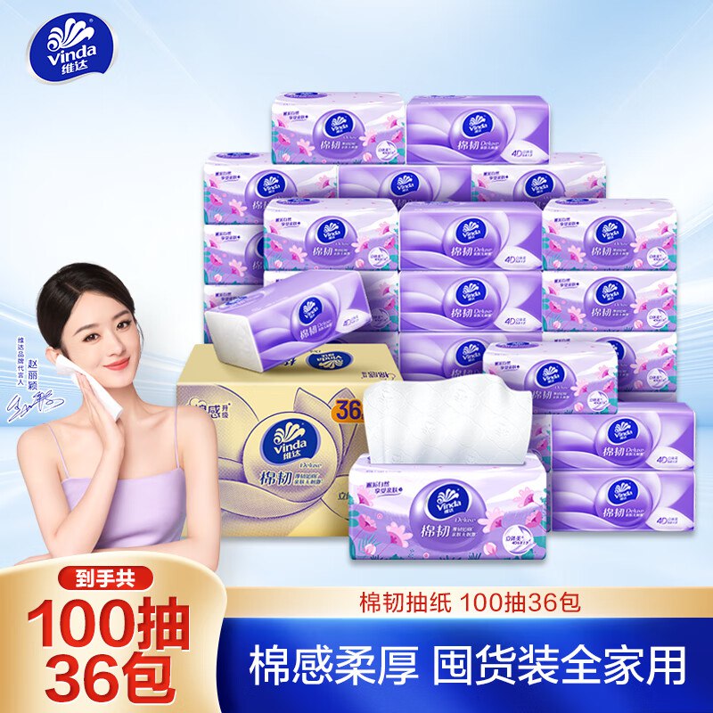 🎒 维达 棉韧3层100抽×36包S码抽纸,