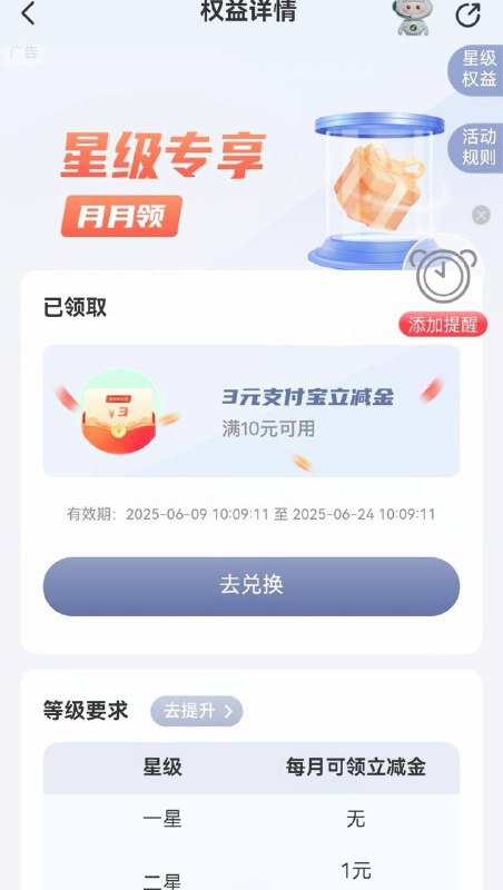 邮储银行app,权益专区,按级别领支付宝/微信立减金