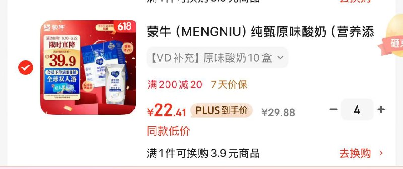 自营 蒙牛纯甄维D酸奶200g×10盒