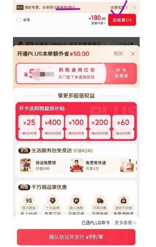 购物车底部“开plus可省50”