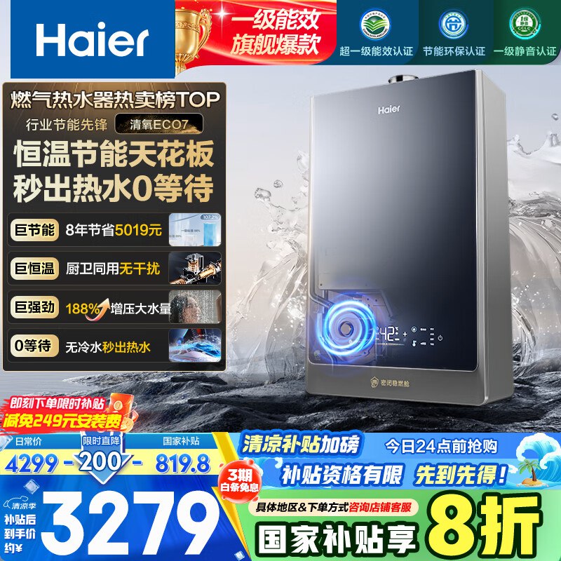 海尔(Haier)【零冷水一级能效ECO7】16升燃气热水器
