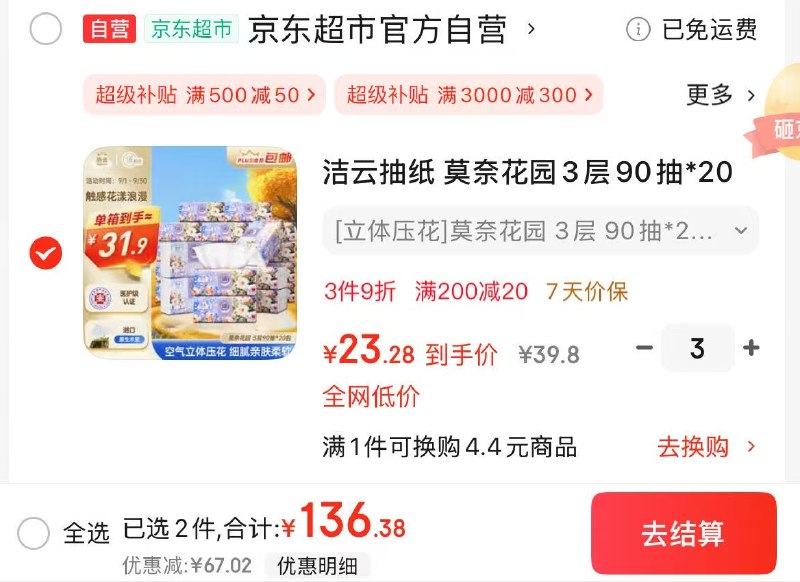 凑后拍3件Plus叠首购69.84元;折1.1/包