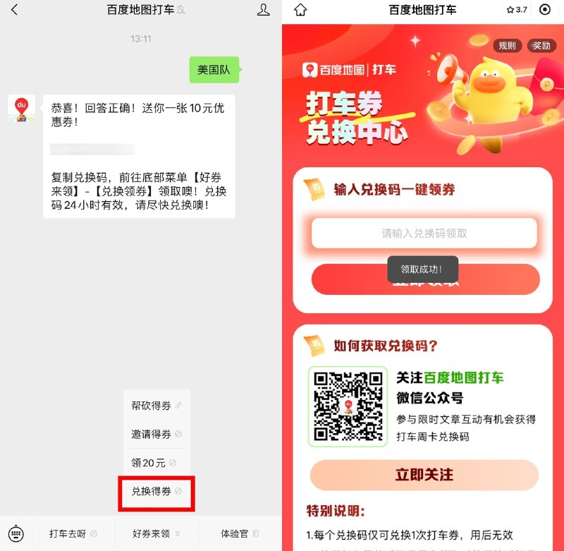 微信关注#公众号:百度地图打车 ->发送“海棠”->复制兑换码根据提示兑换,券是满20-10